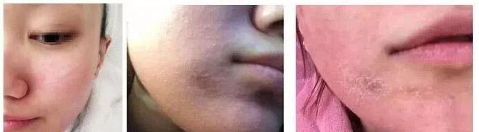 做完之后整张脸泛红比较明显,这是正常现象。一般3-5天会出现脱皮和大面积爆痘。中间图片是痘痘比较严重的时候拍的,都是有白头的痘,这个是肌肤里面的脏东西拍出来导致的,右边就是脱皮比较严重的时候,痘痘一般2-3天就全部消了,脱皮会持续个5-7天左右,脱皮完成了整个治疗也就恢复好了。
