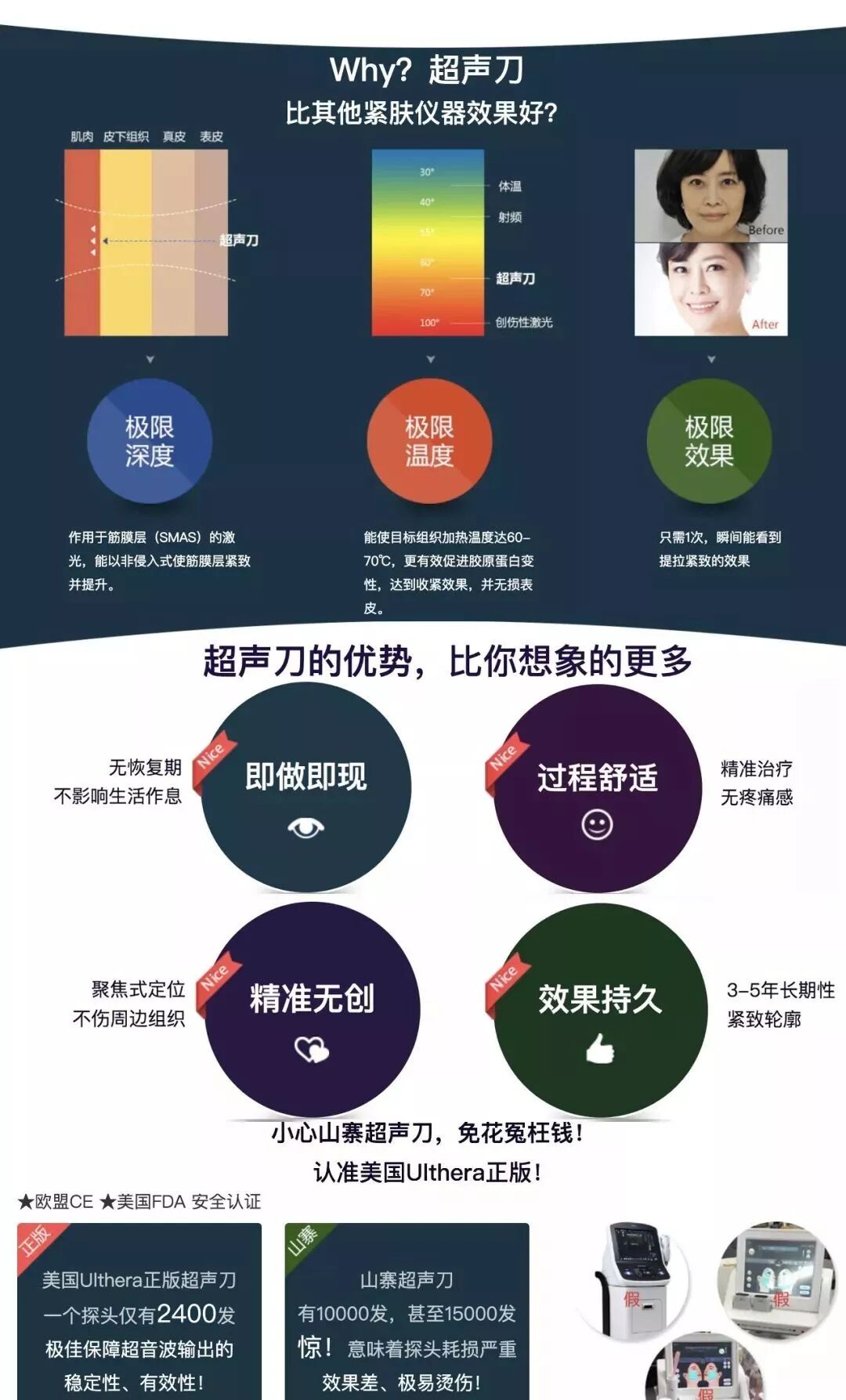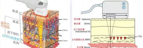 超声刀:1.5mm 3.0mm 4.5mm,可透过同步的超声波扫描,精确作用在极深的筋膜层(SMAS),非手术美容只有超声刀可以达到这一层,达到无创手术拉皮的效果