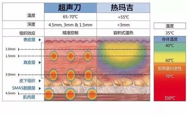 超声刀:皮肤加热温度可达60—70度,可促使胶原蛋白变性,长期来说,可比热玛吉产生更多量的新生胶原蛋白