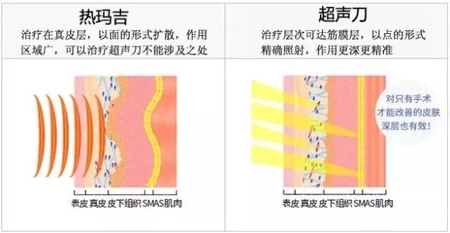 热玛吉:采用的射频更多用于工业上,例如手机信号等,并且射频的能量过大会灼伤皮肤,安全性不如超声波