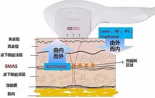 热玛吉:热玛吉能量是由外向内作用,作用皮肤时,能量通过表皮向更深真皮层传导,蕞深到达真皮层。