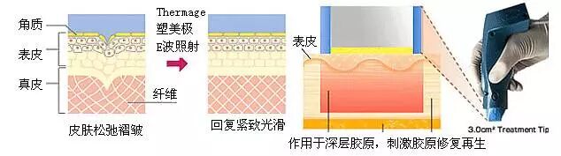 热玛吉是运用专利治疗探头将高能量的高频电波传导至皮肤层,以胶原蛋白收缩效应,造成立即性的皮肤紧实效果,并刺激皮肤胶原新生,达到长效性的皮肤拉提与紧致,从而达到紧肤、除皱、抗衰的目的。